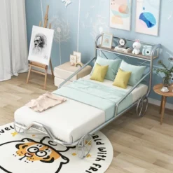 Twin Size Metal Car Bed With Four Wheels, Guardrails And X-Shaped Frame Shelf – ModernLuxe