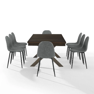 The Hayden 9pc Dining Set is sure to be a showstopper with its combination of farmhouse charm and sleek modern seating. Pairing a substantial wood table with upholstered faux leather chairs, this set delivers an upscale dining experience. The steel tapered legs of the chairs give an unobscured view of the table’s unique trestle base. Beautifully crafted to blend rustic and contemporary aesthetics, the Hayden dining set brings fashion and function to your evening meals. Overall Product Dimensions: 119”W X 87”D X 34”H