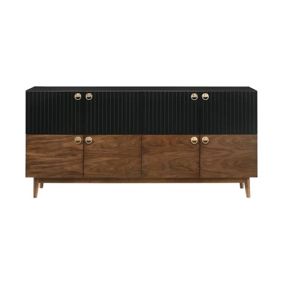 The Amigo Black Veneer and Walnut Wood Buffet from Armen Living is an excellent choice for a functional and stylish accent storage piece for your home. The design features a black finish that will surely help modernize the decor in your home. The Amigo features 8 cabinet doors opening to four storage spaces. The wonderful accents of this table add so much to this piece – especially the striking door pulls that stand out against the dark wood. The four sleek metal tapered legs are crafted with sturdiness and durability in mind – giving you peace of mind for the longevity of this item. Product Dimensions: 67″W x 18″D x 31″H