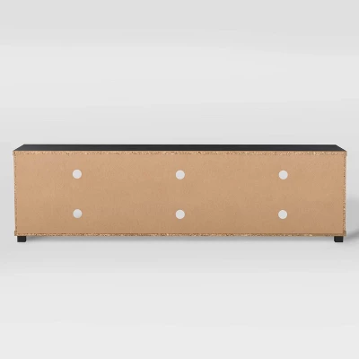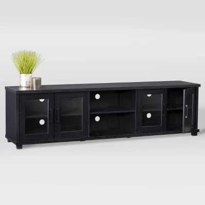 Elevate your entertaining space with this classic TV bench. A beautiful wood grain finish in a rich black, this bench is designed to accommodate all your storage needs. With enclosed shelving areas on both ends and adjustable shelves to fit any and all of your A/V equipment, gaming console and accessory heights. Sit back, relax and control all your equipment from the remote through the framed tempered safety glass doors. Keep your space tidy and organized with center open shelves and cable management openings in each storage area. A classic piece that will truly last a lifetime.
