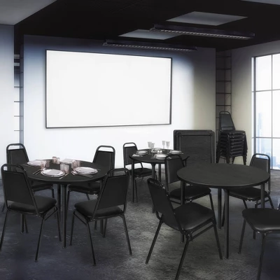 Turn any table into a folding table with Kee Folding Post Legs! Kee Folding post legs come four to a set and can collapse while attached to a tabletop. Simply twist the leg to unlock, fold down and twist in the opposite direction to lock back into place. This 48-inch round table assembles in a snap with just a few screws. The table is constructed of a thermal fused melamine laminate tabletop that is 1-inch thick and finished with a black T-Mold edge band. This Ash Grey tabletop is double-sided and finished in White on the other side. Simply pick the side you like and install the base on the other. Self tapping wood screws and a placement template are included. Laminates are scratch, stain and scald resistant and wipe clean easily. Rounded corners make the table safer for everyone. A sleek alternative to pedestal style bases, this set of post legs comes in a classic black to match any decor. The legs are constructed of tubular steel with leveling glides on the bottom of each leg. Kee tables are backed by a 10-year limited manufacturer’s warranty.