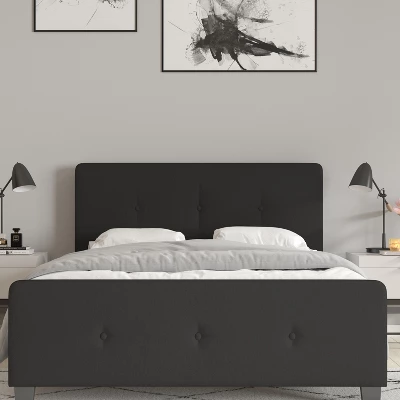 Compliment any bedroom with this versatile platform bed with elegant beige button tufted fabric detailing. The matching head and foot board are both slim profile designed to maximize your bedroom space. The sturdy frame features 14 wooden slats that support the mattress without the use of a box spring. Whether you are starting new or updating your bedroom, this elegantly tufted platform bed is the ideal pick for any home.