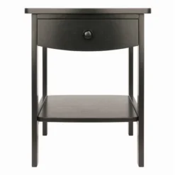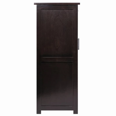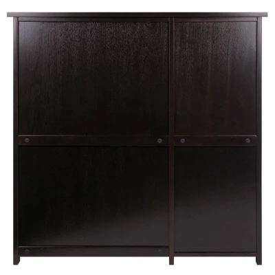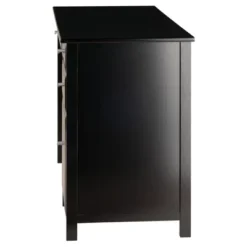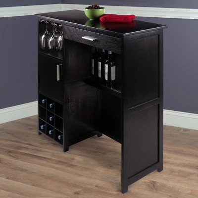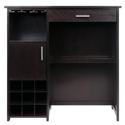 Host a dinner party or enjoy a special night at home, knowing your favorite wines, glassware, and bar accessories are beautifully organized in the Moscato Wine Bar. With a contemporary dark Coffee finish and clean, straightforward lines, this wine bar has a place for everything. On one side is a built-in stemware holder, a cabinet with door for additional storage, and a wooden wine grid to hold up to 9 bottles. On the other side is a wide drawer for accessories and a removable shelf with lip for storing additional bottles securely. An open space below the shelf provides ample standing room for you to tend bar for guests. Stash an extra case of beer or wine there for a larger party. Made of Solid and composite wood with silver plastic drawer and cabinet pulls.