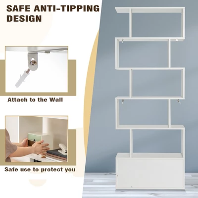 Get everything within reach with this s-shaped 6-tier bookshelf!Made of premium engineer wood,this 6-tier geometric bookcase is durable and sturdy. Designed with 6 tiers open shelves as well as an enclosed cabinet,the s-shaped bookshelf will accommodate various items for you. Meanwhile,the anti-falling devices ensure your family’s safety. The multifunctional design enables it to act as a bookcase,display shelf and room divider. Therefore,you can use it in your living room,bedroom and study. When it comes to daily maintenance,the smooth and waterproof surface offers great convenience.