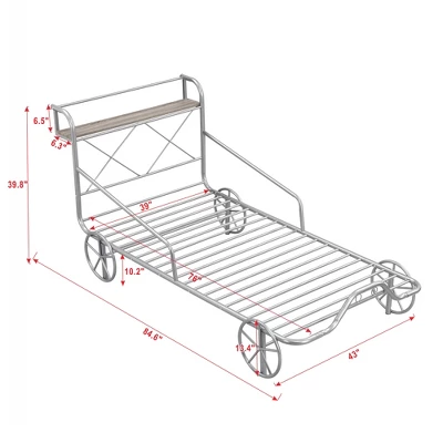 Twin Size Metal Car Bed With Four Wheels, Guardrails And X-Shaped Frame Shelf – ModernLuxe