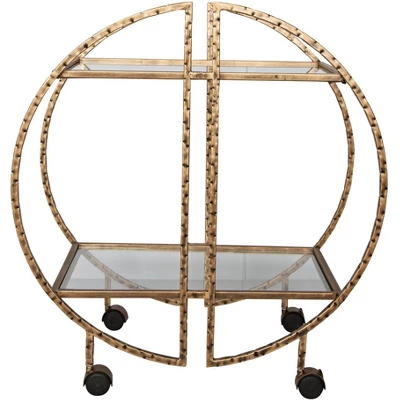 Taking on the festive geometric shaping that made Mid-Century Modern designs a classic, the Zelina contemporary two-shelf bar cart delivers eye-catching style along with a ton of function. Dress up a modern space with this cart by Uttermost, flaunting an antique gold finish over hand-forged, hammered iron frame construction. Open circles form a whimsical outer frame, with clear tempered glass shelves attached. Rolling casters allow portability for serving around the room.