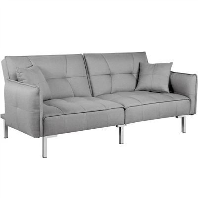 - This convertible fabric sofa bed futon offers an all-in-one sofa solution for your small spaces. It is built of a durable hardwood/plywood frame and metal legs to last for years. An ergonomically adjustable backrest adds to your reclining comfort. Take full advantage of 3 leaning/lying positions at 105, 140 or 180 degrees, and you’ll enjoy the sofa comfort at different levels.